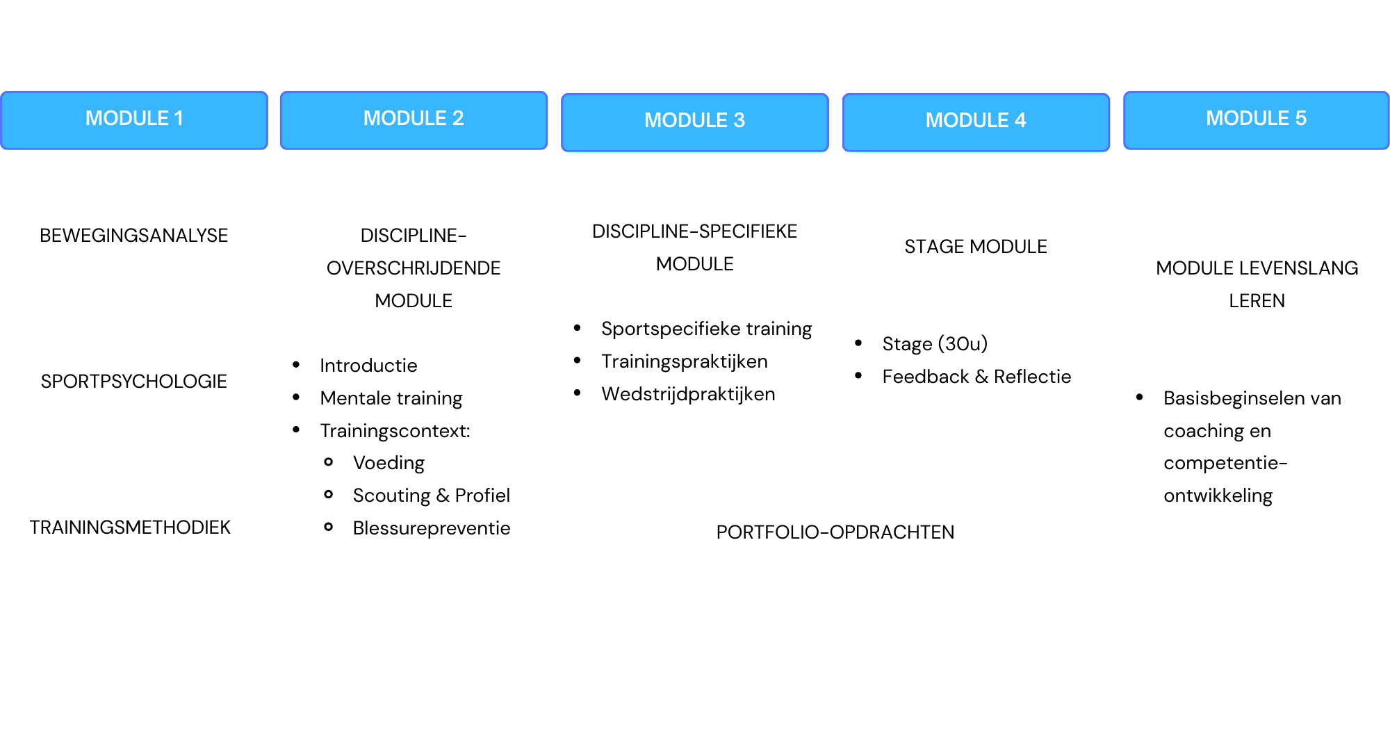 De eerste module bestaat uit drie sportwetenschappelijke kennisvakken: