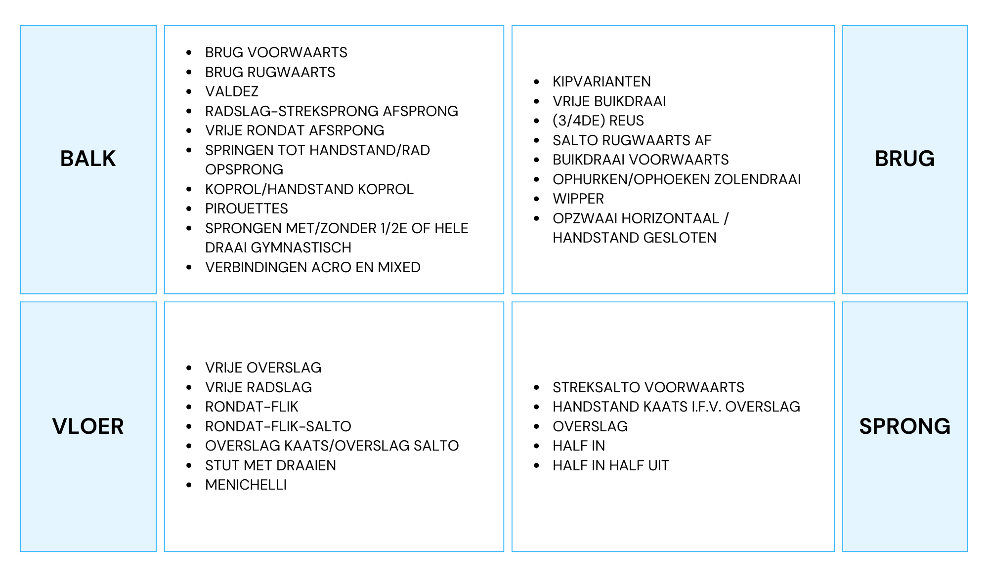 - Trainers met een VTS-diploma Trainer C, Trainer B, Trainer A of Instructeur in de discipline Toestelturnen meisjes.