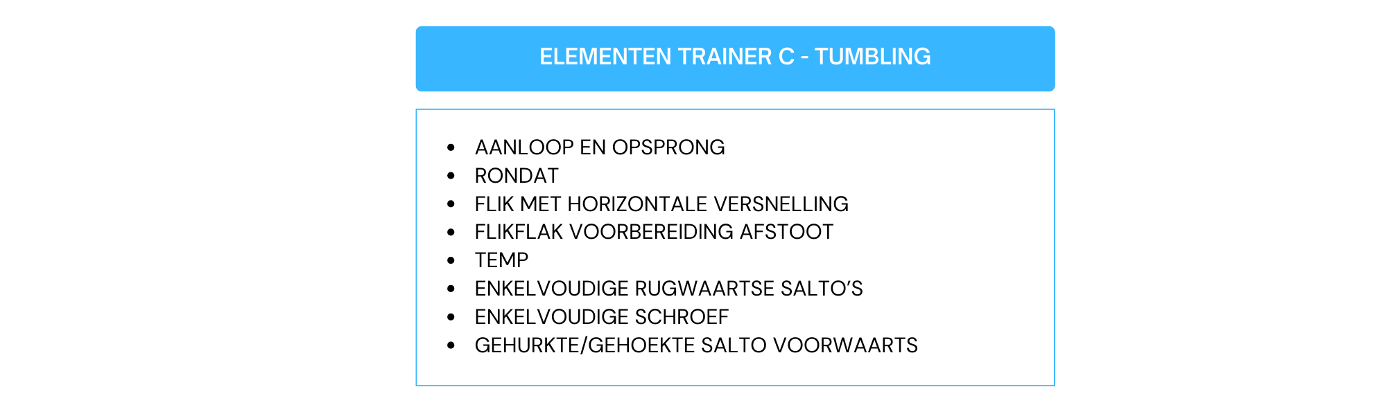 - Trainers met een VTS-diploma Trainer C, Trainer B, Trainer A of Instructeur in de discipline Tumbling.