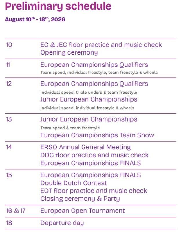 In augustus staat het Jeugd Europees Kampioenschap (13-15 jaar) en Europees Kampioenschap (16+) Rope Skipping op het programma in Melsomvik, Noorwegen. De selecties vinden plaats op 22 november 2025 (individuele selecties), 21-22 maart 2026 (teamselecties), 4 april 2026 (Double Dutch Contest) en 9-10 mei 2026 (Show Competitie).