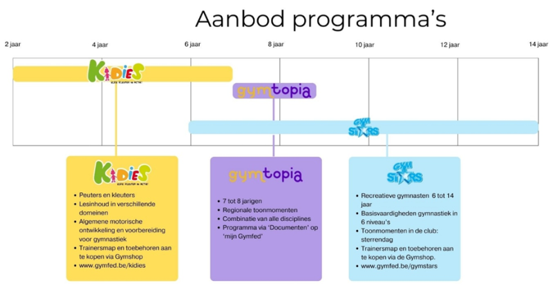 Gymnasten van 6 tot 14 jaar binnen een brede mix van disciplines.