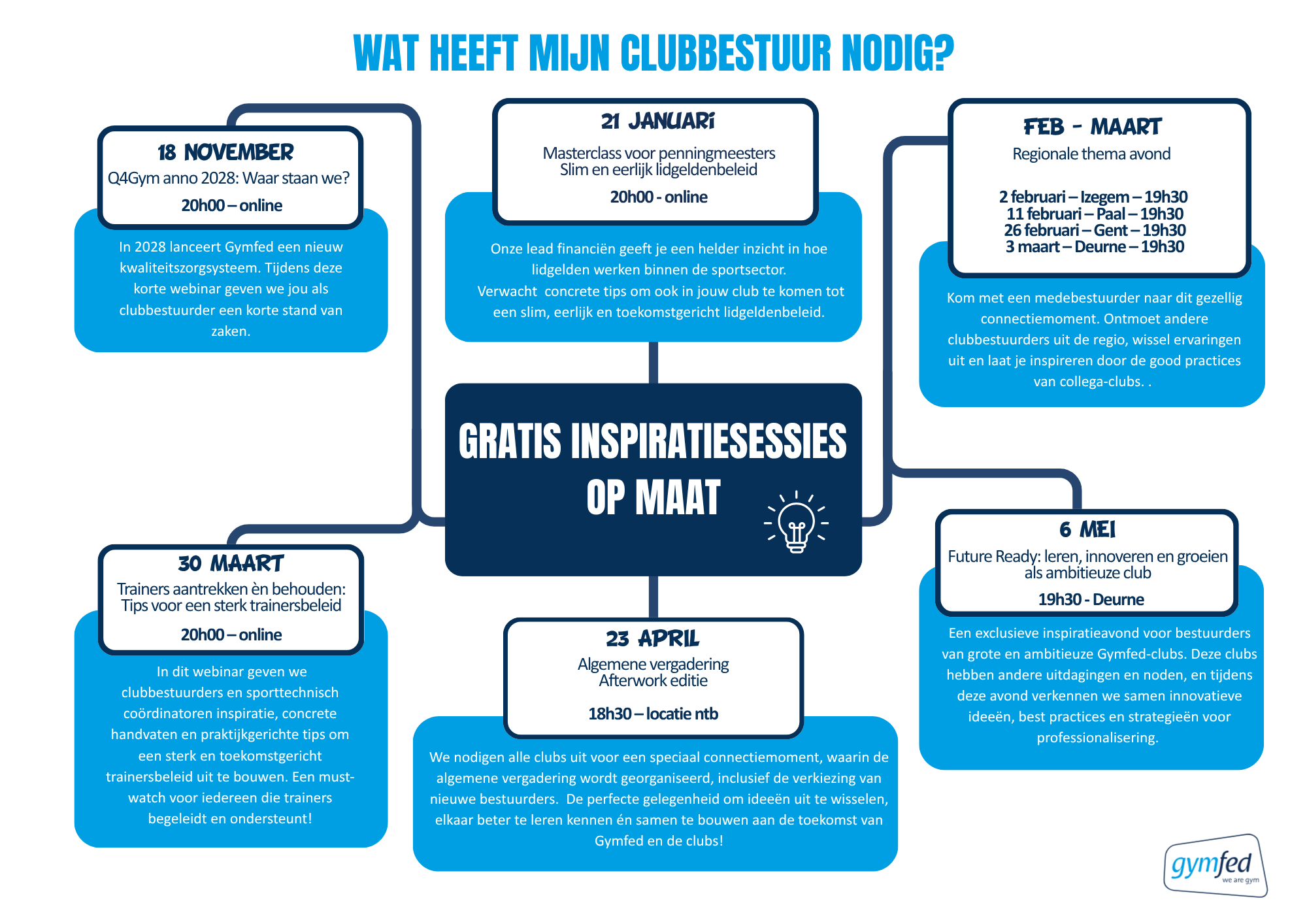 Het nieuwe sportseizoen is van start gegaan. Ook dit jaar staan er heel wat inspirerende connectiemomenten en leerrijke bijscholingen op de agenda voor clubbestuurders. Want een goed bestuur is de ruggengraat van elke sportclub, en investeren in kennis en uitwisseling zorgt ervoor dat jouw club klaar mee evolueert.