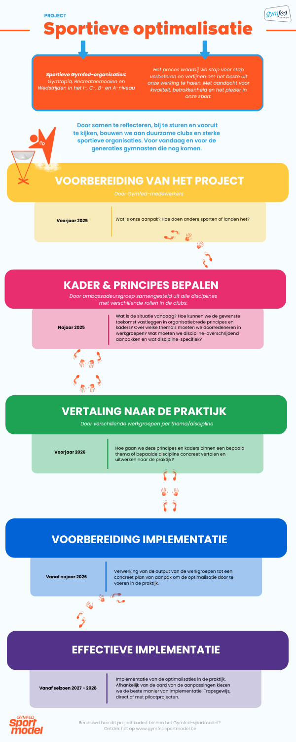 Neen, geen plotse of onverwachte veranderingen. Sportieve optimalisatie gaat niet over veranderen om te veranderen, maar over doordachte verbeteringen die logisch aanvoelen en breed gedragen zijn. Wat goed werkt, willen we behouden. Waar het beter kan, willen we samen bijsturen. De timing en mogelijke stappen worden steeds duidelijk gecommuniceerd (zie visual).